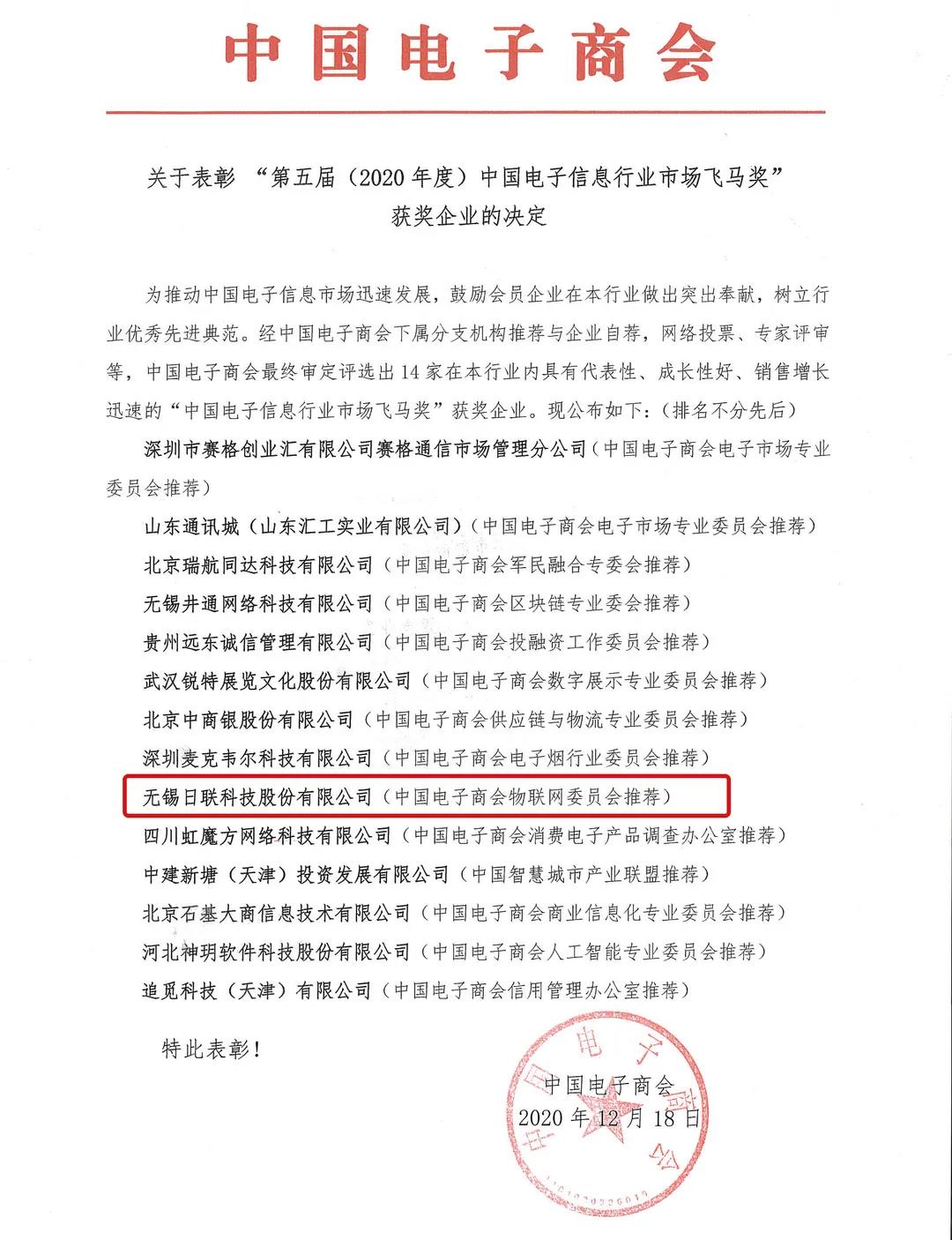 2020年12月18日,第五届(2020年度)中国电子信息行业市场飞马奖评选隆重揭晓,这是中国电子商会年度评选的**奖项,米兰科技荣誉在列。